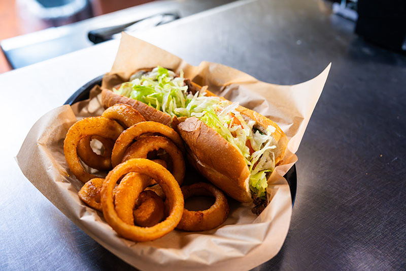 Chopped steak, green peppers, onions and mozzarella cheese.